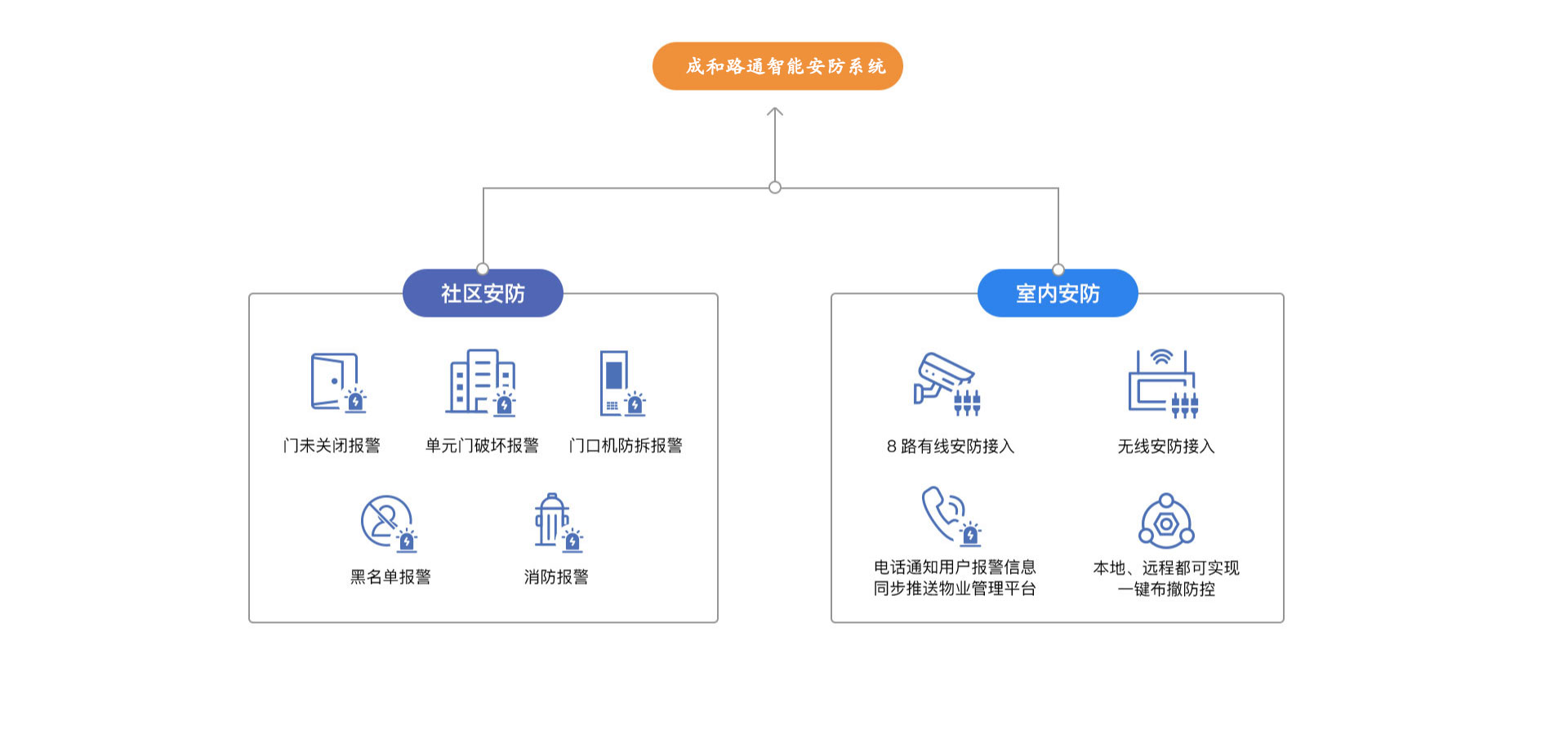 智能安防系统,基于全场景安全防护需求,打造社区报警+室内安防报警 体系,全方位守护社区安全。